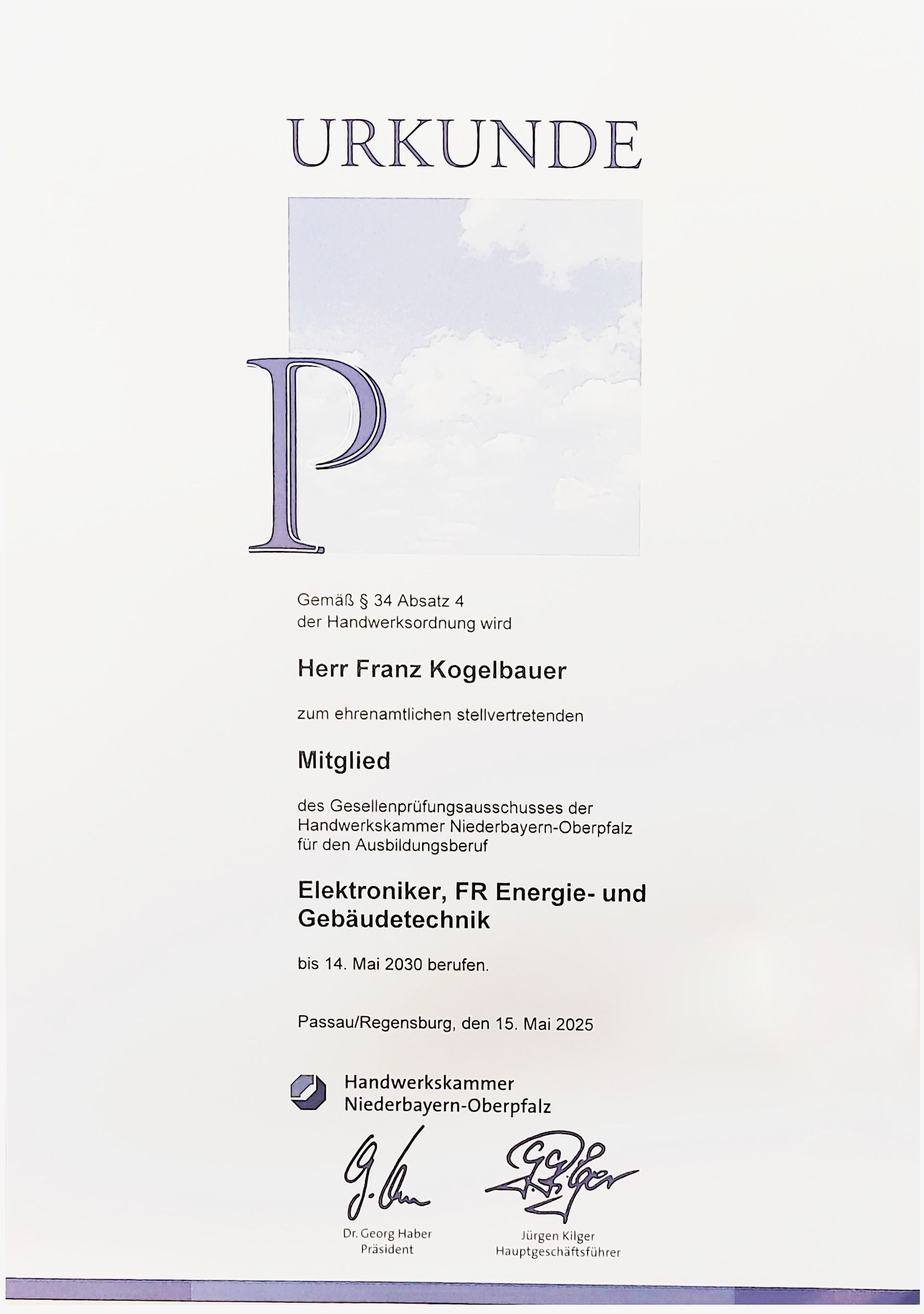 Mitglied des Gesellenprüfungsausschusses der Handwerkskammer Niederbayern-Oberpfalz für den Ausbildungsberuf Elektroniker, FR Energie- und Gebäudetechnik